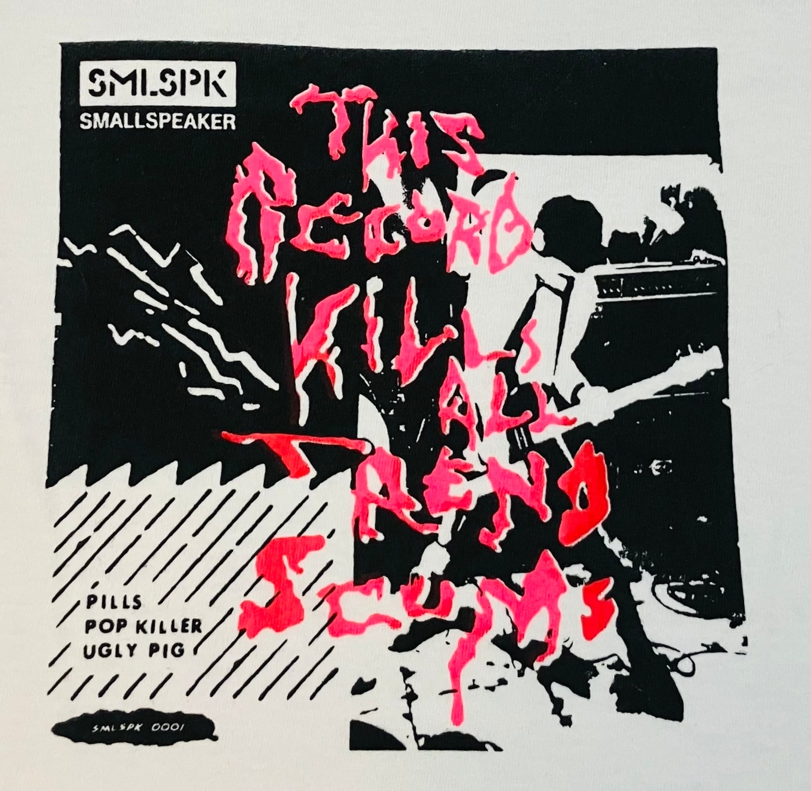 This record kills all trend scums T shirt black neon pink S ボディーカラーホワイト